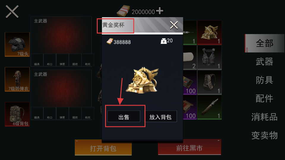 1、变卖【黄金奖杯】可获得【388888】货币与【20】碎片,积累资源助力后续武器升级与战斗准备。