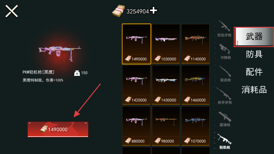 2、在武器商店选择【PKM机枪-黑鹰】,花费【149000】货币购入,其伤害加成100%能提升战斗输出效率。