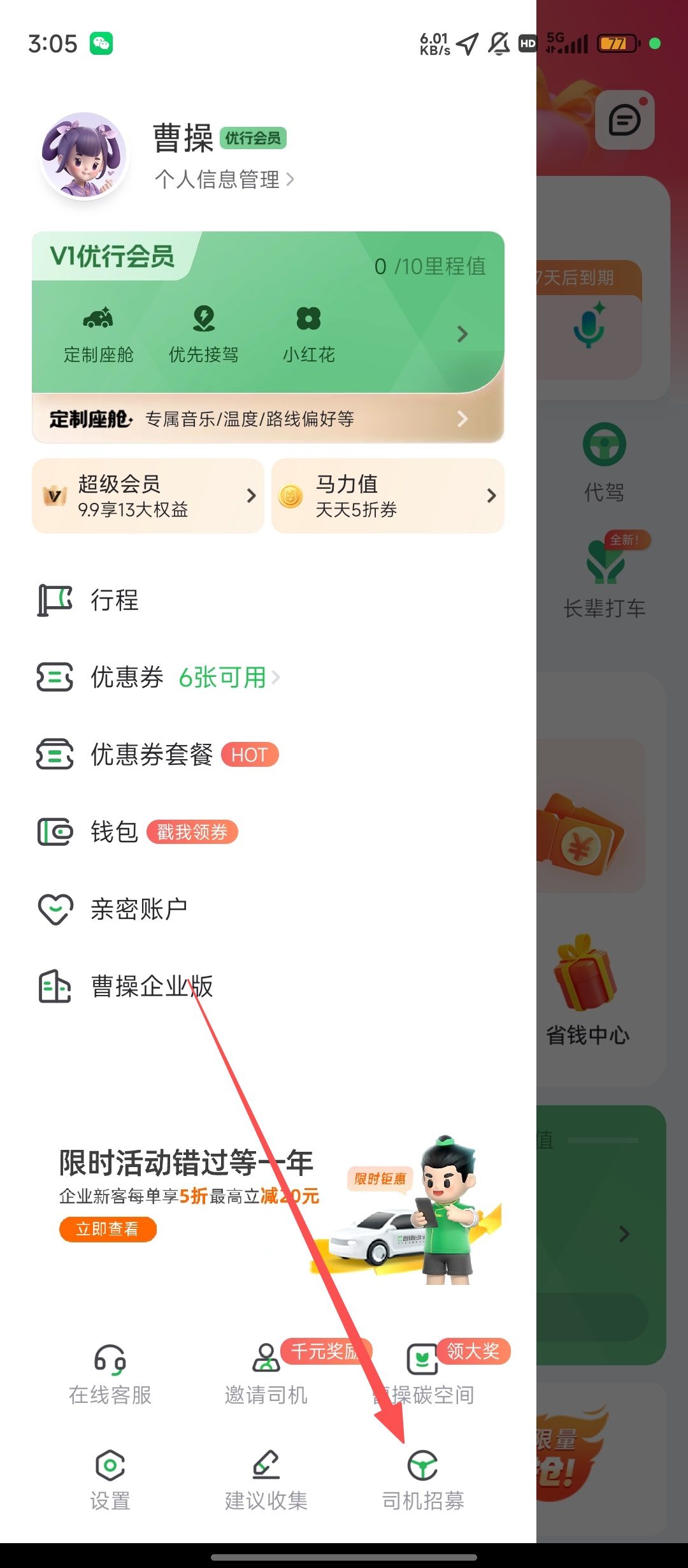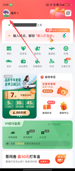 1、打开曹操出行,点击左上角头像,进入个人功能界面,方便后续操作呀。