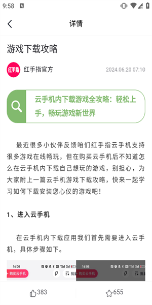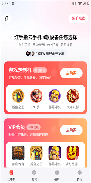 红手指云手机是一款手机管理软件,针对平时喜欢打游戏的用户来说是一款很不错的软件,可以24小时享受流畅的运行过程,有效的管理手机的网络速度,保持流畅的体验,结合力强大的技术支持,将会很好的管理手机的运行,让用户在游戏过程中可以更流畅的体验不同的游戏工具,而且操作非常的简单,直接绑定自己的手机号就可以畅享各种游戏,而且都是免费的,可以直接下载,不需要root权限就可以操作,享受更流畅的游戏速度。
