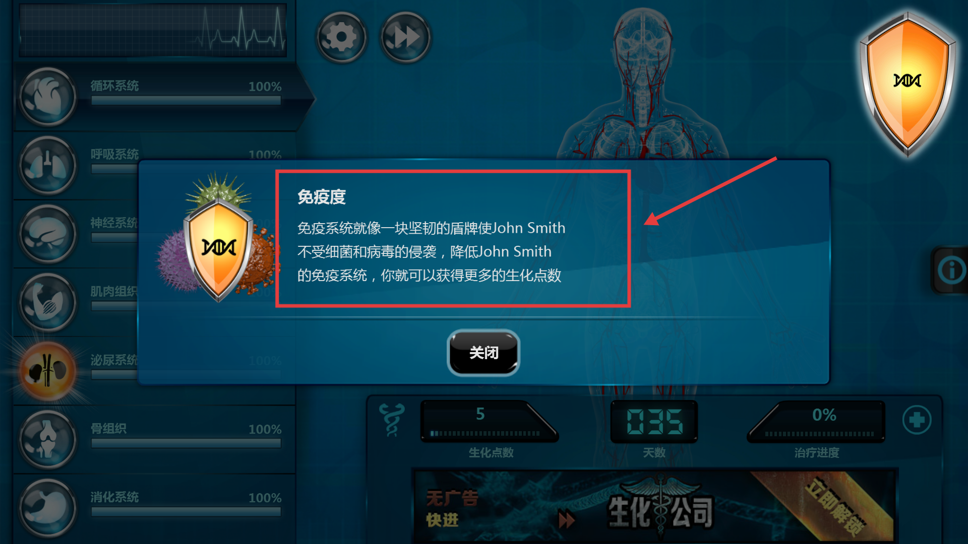 2、降低病人【免疫力】可获更多【生化点数】,免疫系统如盾牌削弱它能推进病情发展。