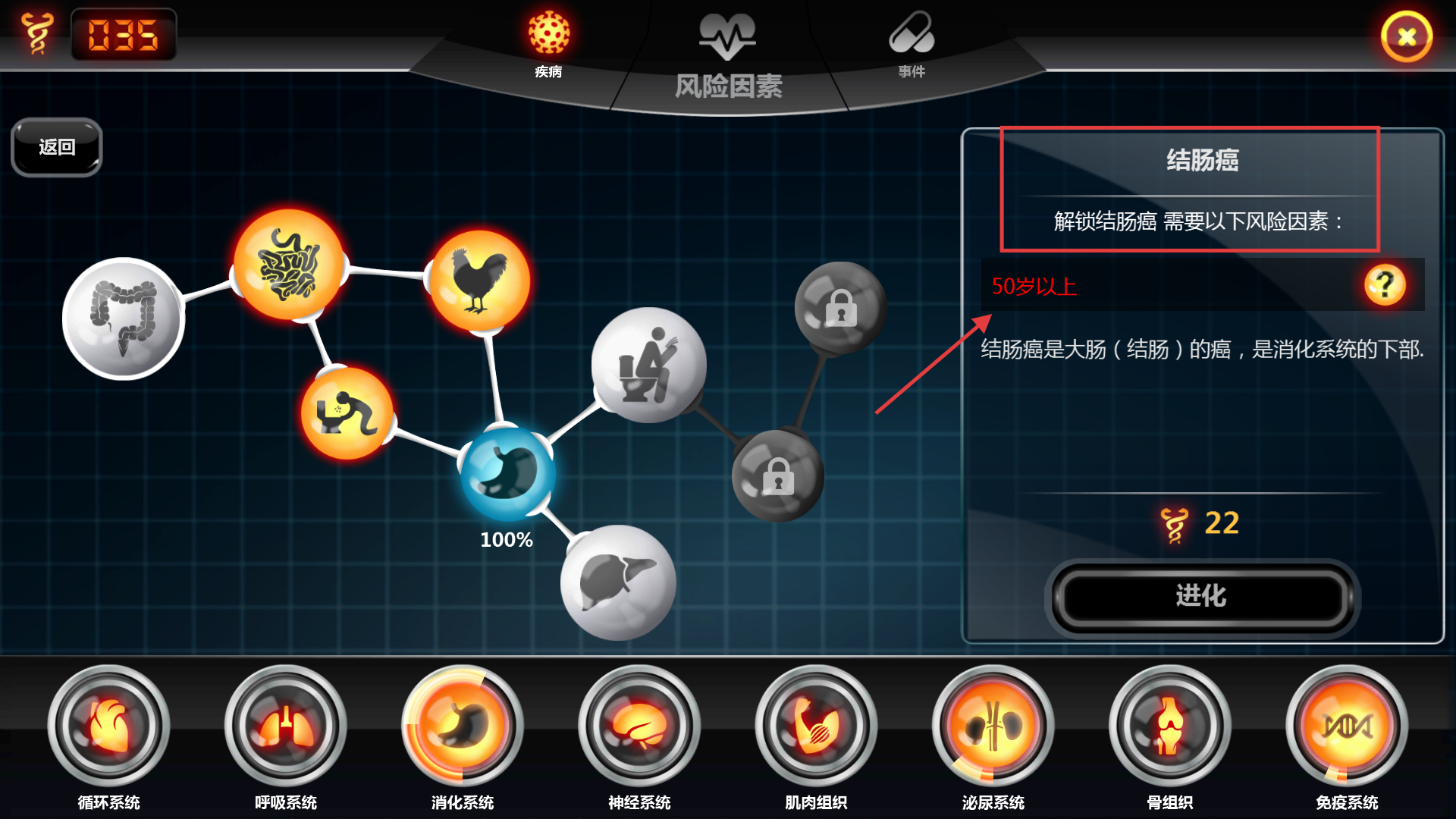 4、满足【50岁以上】风险因素,消耗22点【生化点数】进化【结肠癌】解锁更致命疾病。