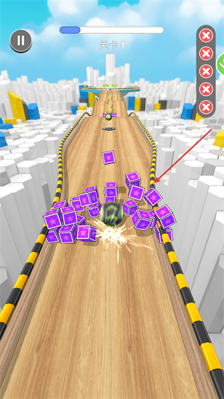 2、遇到【紫色方块】障碍物时,需控制小球力度撞开它们,避免撞击过强导致小球飞出赛道。