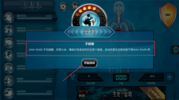 2、关卡1目标是在医生治愈前干掉【JohnSmith】,需针对其超重久坐等不健康状态制定快速策略。