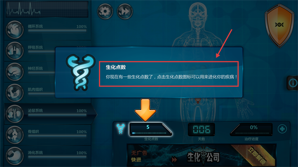 3、积累【生化点数】,点击对应图标可进化疾病,提升病毒感染效率与破坏人类免疫力的速度。