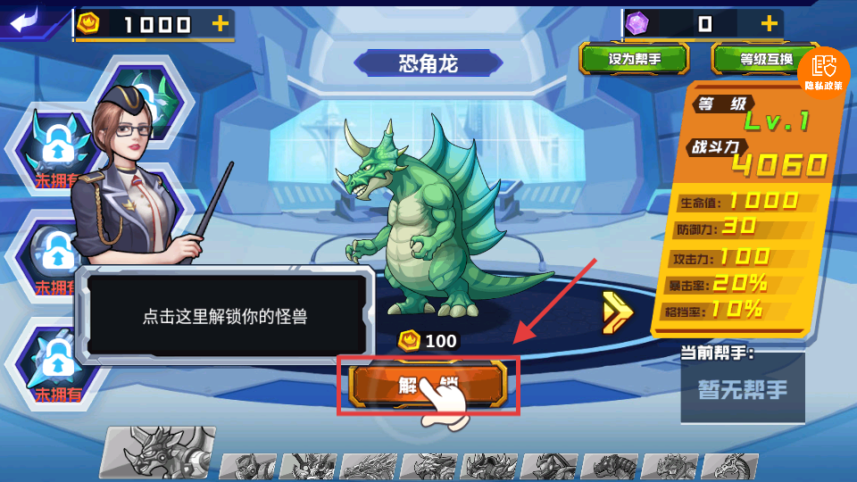 1、消耗【100】货币解锁【恐角龙】怪兽,解锁后可将其设为帮手提升战斗能力。