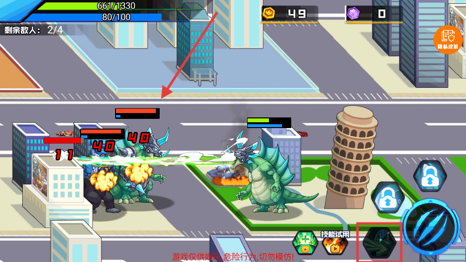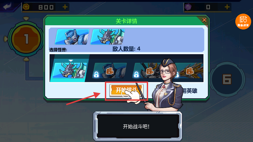 2、选好可用怪兽后点击【开始战斗】按钮,进入敌人数量为【4】的关卡展开格斗。