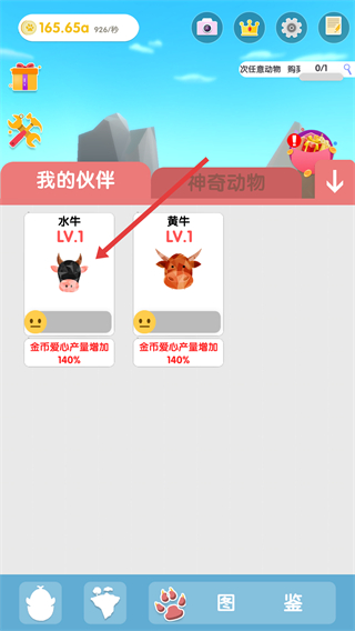 2、在【我的伙伴】界面中,点击红色箭头指向的【水牛LV.1】,可查看其属性及对金币产量的加成效果。