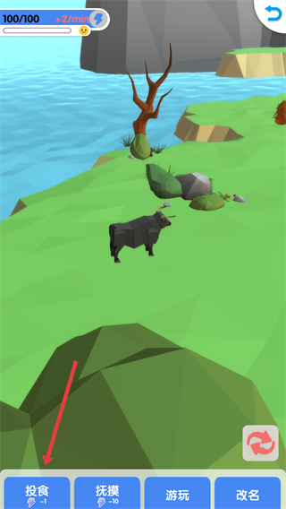 3、进入动物互动界面后,点击红色箭头指向的【投食】按钮,消耗道具为动物投食。