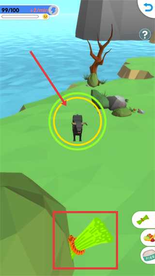 4、投食时,将红色框内的食物投喂给红色箭头指向的动物,提升动物的状态值,增强其对金币产量的加成。