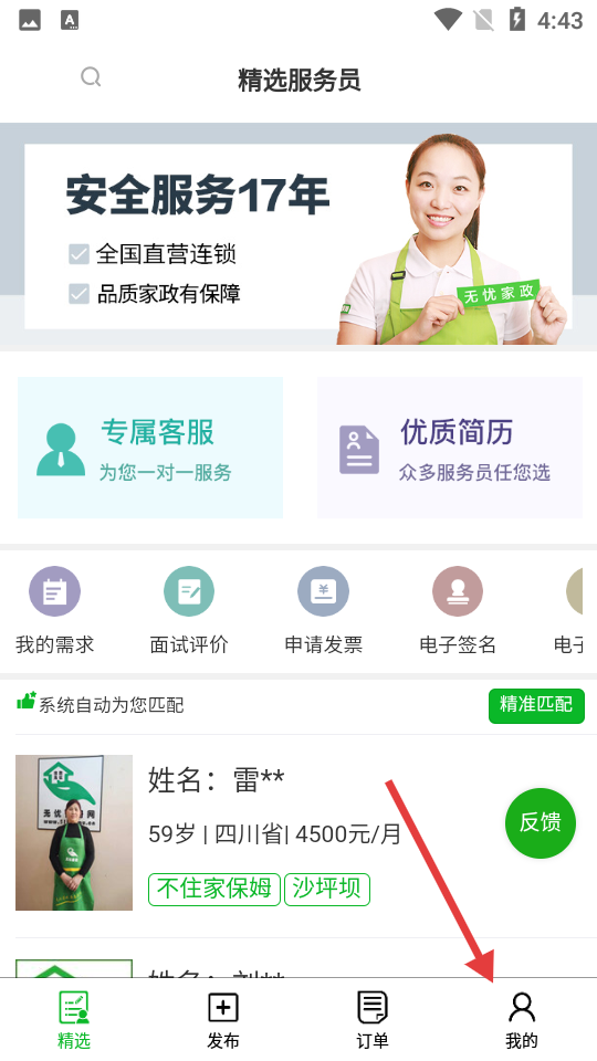 1、下载安装无忧家政app,进入软件后可以按照分类,通过自己的需求来挑选各种服务人员。