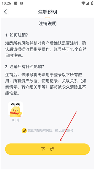 4、勾选“我已清楚所有风险,确认注销账号”后,点击“下一步”按钮,继续账号注销流程。