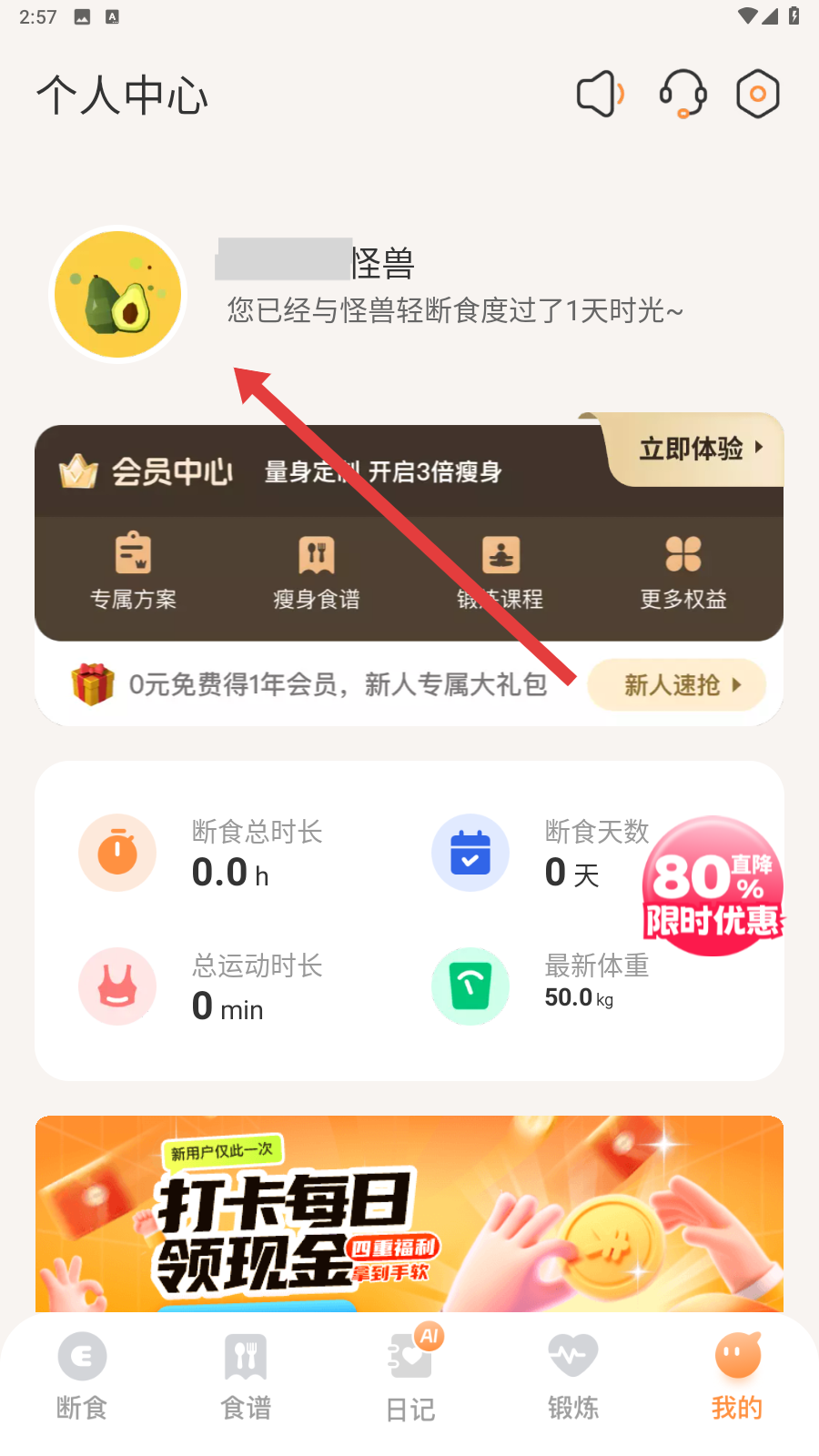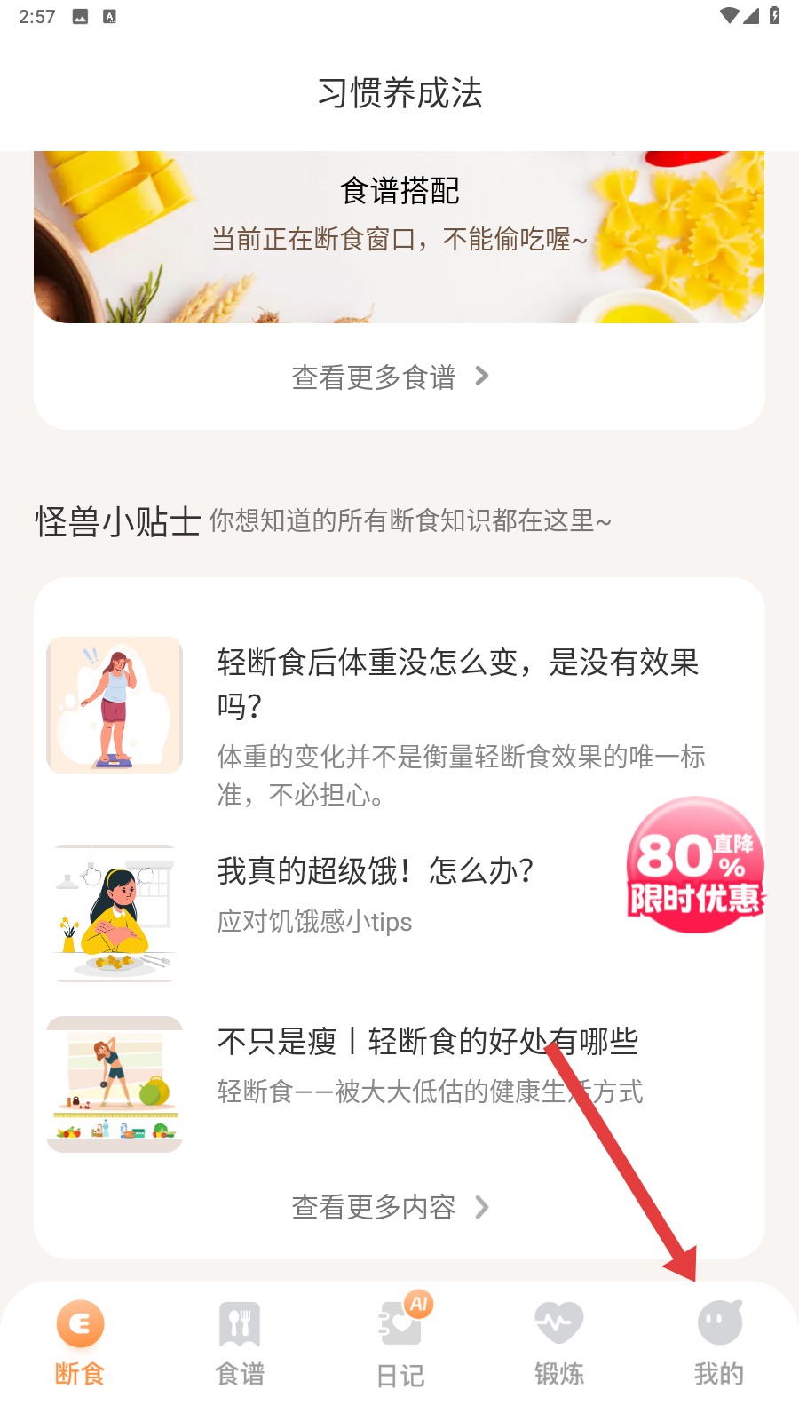 1、我们打开【怪兽轻断食】App后,点击底部导航栏的【我的】,进入个人主界面哦。