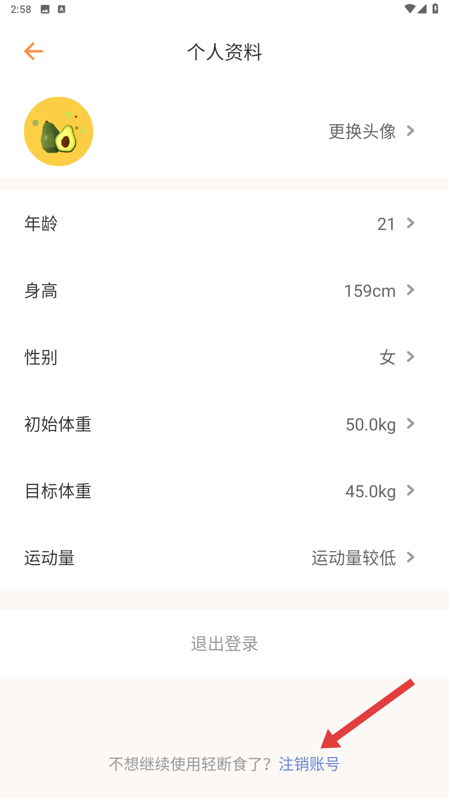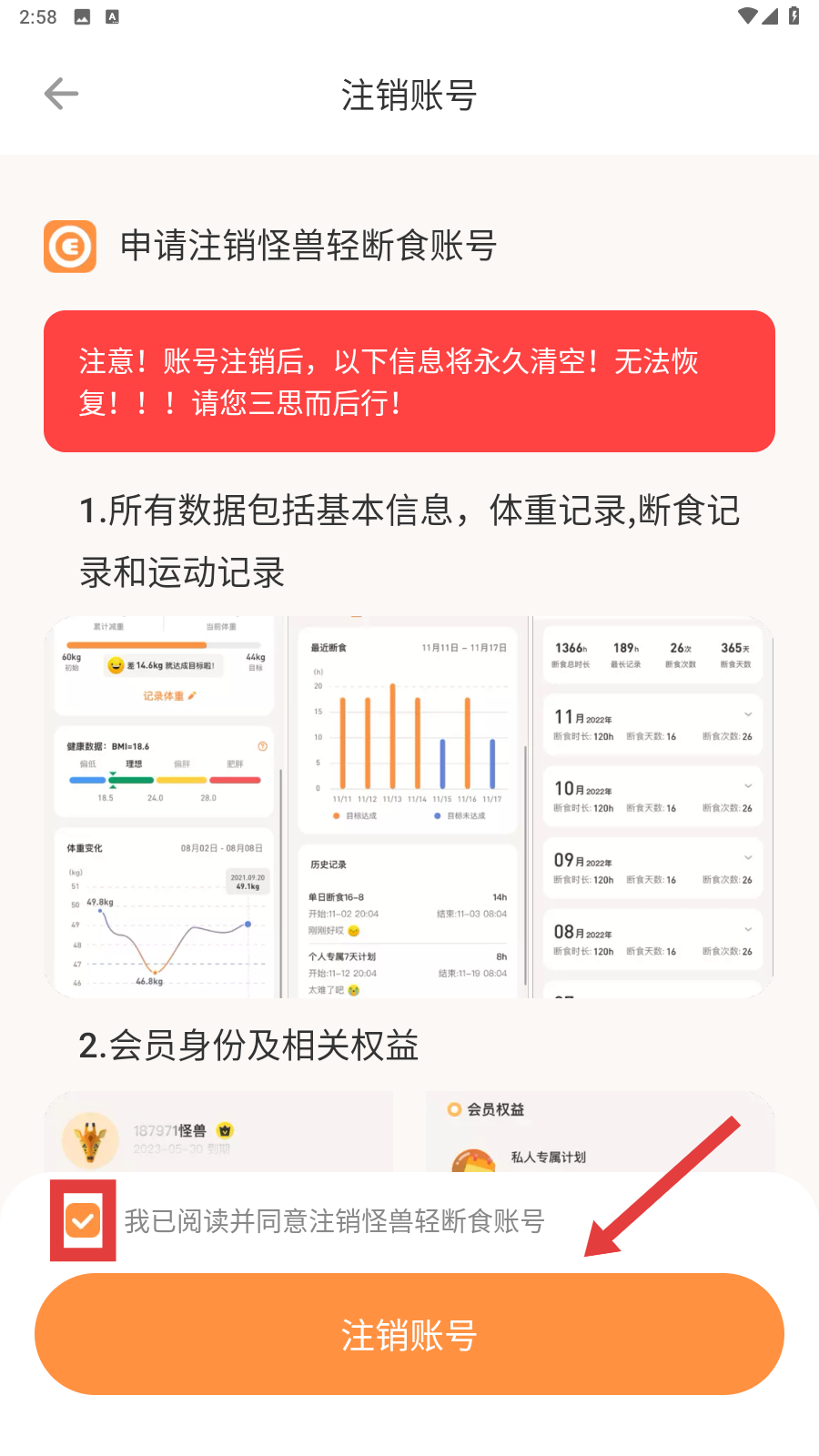 4、在注销账号界面,勾选【我已阅读并同意注销怪兽轻断食账号】,再点击橙色的【注销账号】按钮即可。