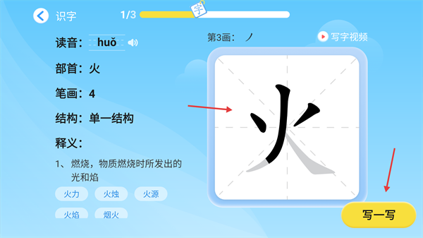 3、可查看该字的读音、部首、笔画等信息,点击【写一写】按钮开始书写练习。