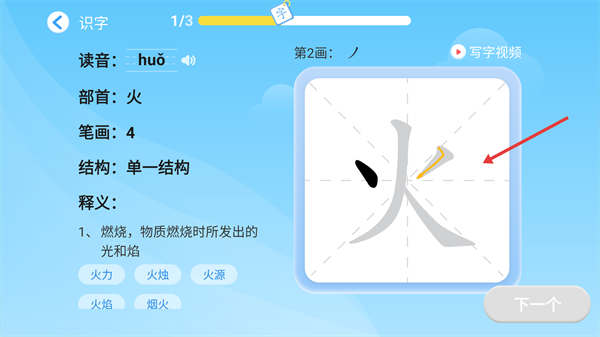 4、按照笔画指引完成汉字书写练习后,点击【下一个】按钮,继续学习。
