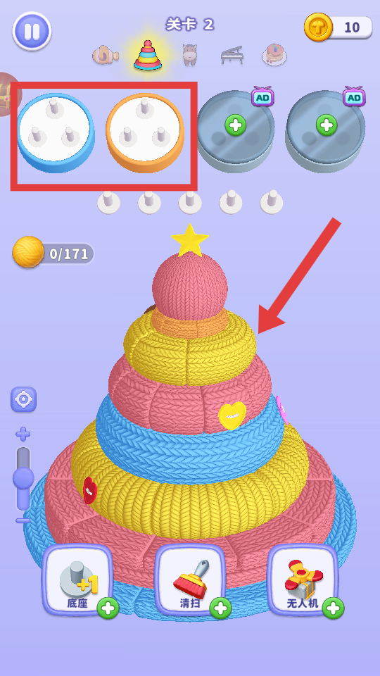 1、进入游戏后,先观察上方红框内不同颜色的【底座】,选择颜色相同的毛线进行点击放置。