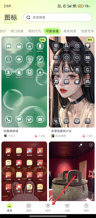 3、组件里有很多可爱的工具,可以用来装饰你的手机桌面。