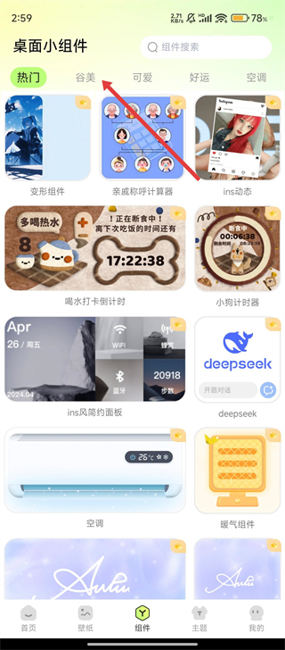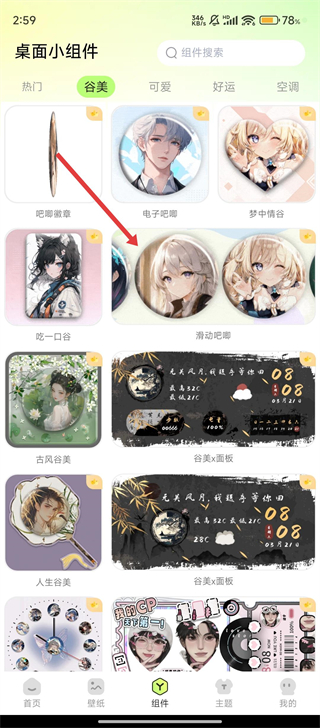 2、进入组件页面后,轻点顶部【谷美】标签,切换到对应分类,就能浏览各类谷美相关组件啦。