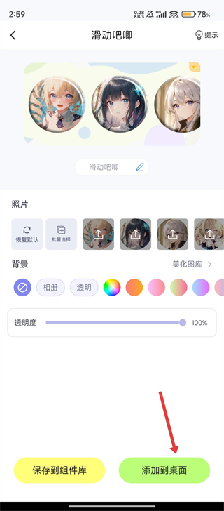 4、在【滑动吧唧】编辑页调整背景等设置后,点击【添加到桌面】按钮,就能将这个组件放到桌面啦。