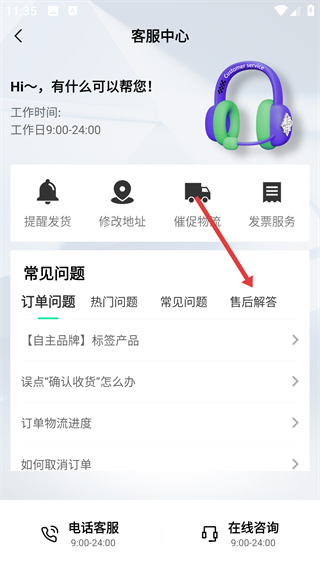 2、进入【客服中心】,找到并点击【售后解答】标签哦。