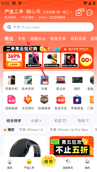 1、打开爱回收,点击底部【严选二手】,进入后可看到【精选】、【手机】等分类,还有官方验机等品质保障说明。