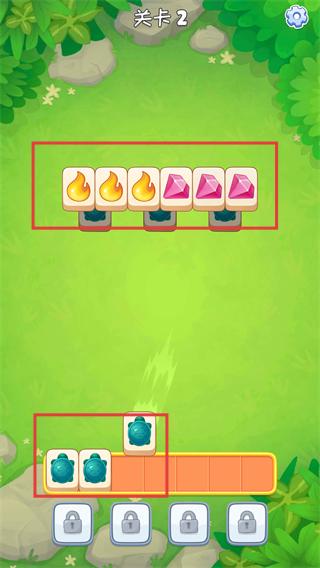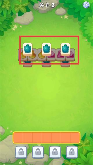 1、关卡2中,先点击上方的相同道具(如乌龟),将其移动到下方的槽位中进行归类。