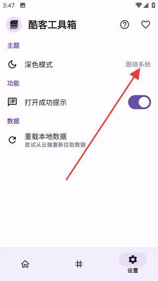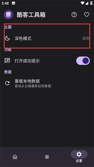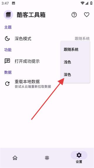 3、在弹出的选项中选择【深色】,即可将酷客工具箱的显示模式切换为深色。