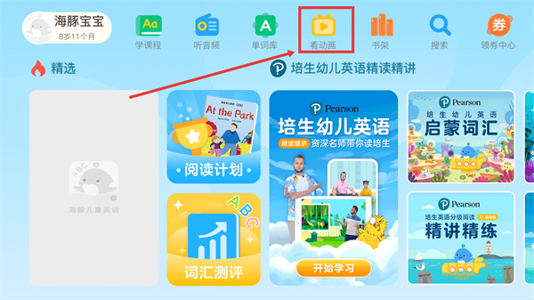 1、进入界面后,找到顶部的【看动画】按钮并点击,可进入动画类学习内容页面。