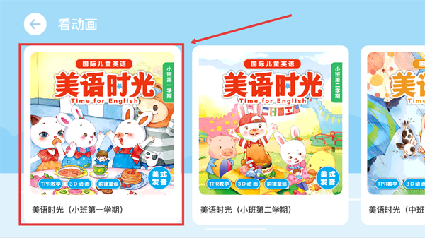 2、在【看动画】页面,选择【美语时光-小班第一学期】内容。