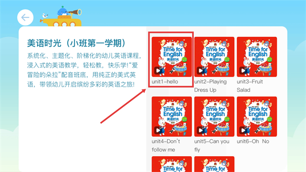 3、进入对应学期页面后,点击【unit1-hello】单元。