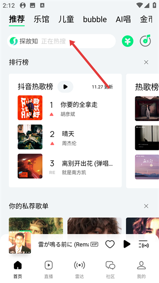 1、打开QQ音乐App,点击顶部搜索栏准备输入内容哦。