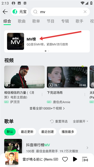 3、在搜索结果页,点击【MV榜】进入其页面吧。