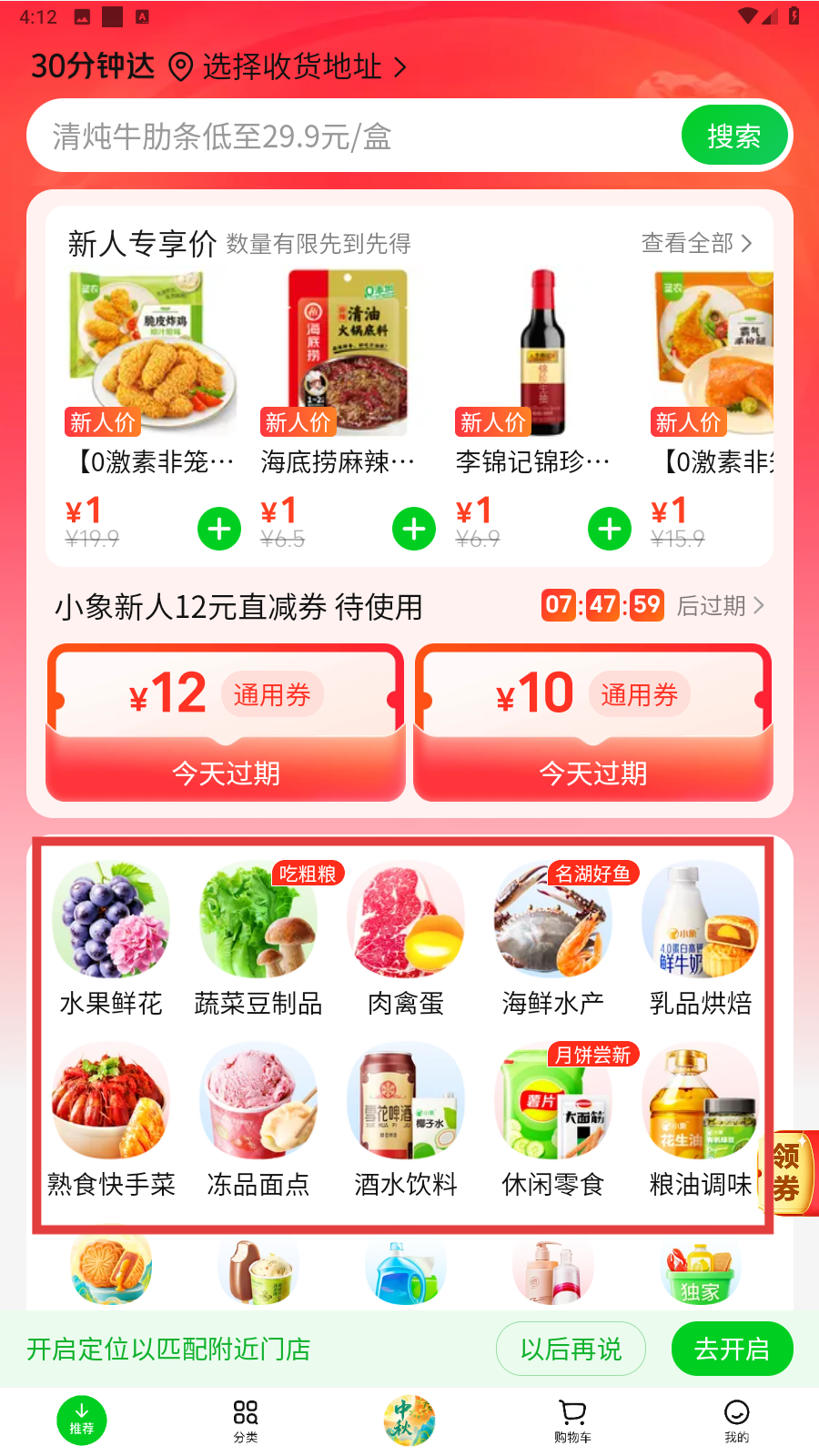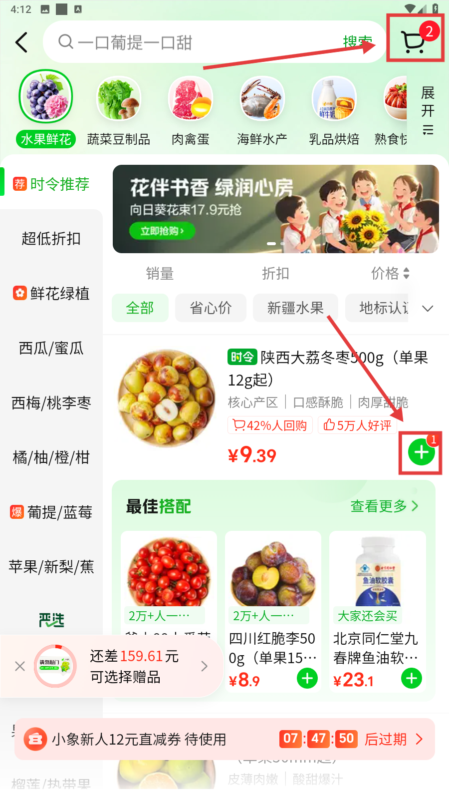 1、我们打开小象超市,首页有【水果鲜花】、【蔬菜豆制品】等分类,挑选心仪品类,便可进入对应商品页面啦。