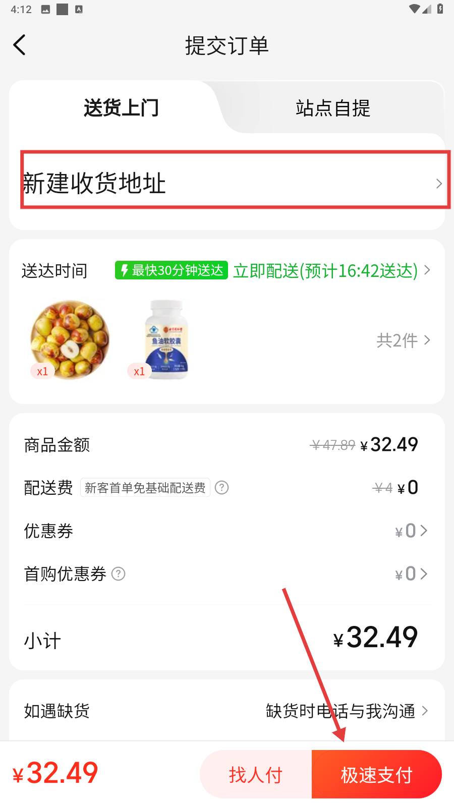 4、到提交订单页面,先设置好收货地址,再点击【极速支付】,就能完成订单支付,坐等商品送达咯。
