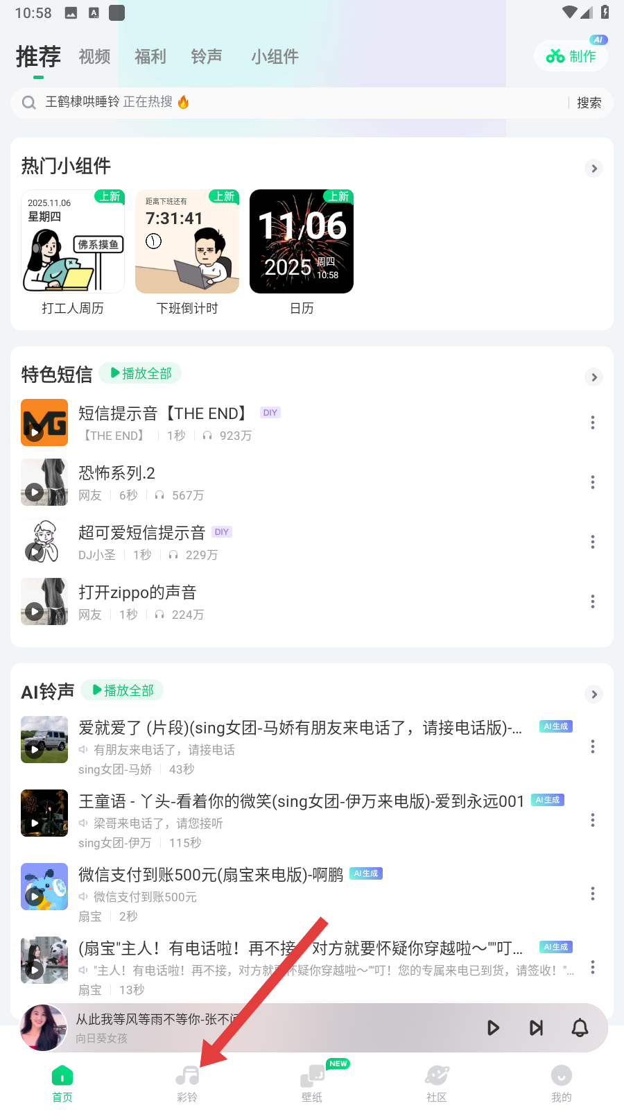 1、打开酷狗铃声APP,点击底部【彩铃】选项,进入彩铃推荐页面啦。