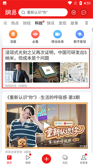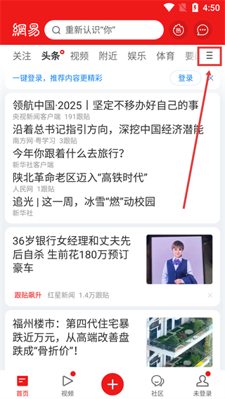 1、先打开网易新闻软件,进入首页后可切换至视频、社区、发布、我的页面,点击页面正下方【加号图标】。