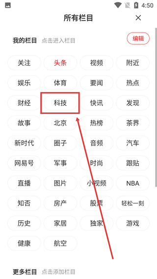 2、进入所有栏目页面后,点击【科技】栏目选项,即可切换到科技分类的内容页面,查看相关资讯。