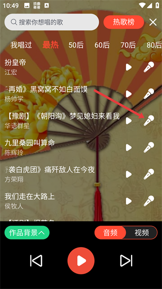 3、在选曲界面,找到想唱的戏曲,比如豫剧【朝阳沟】,点击右侧麦克风图标,就能开始演唱哟。