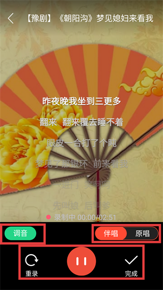 4、演唱时可调整【调音】、【伴唱-原唱】,若不满意可重录,满意后点击【完成】就能保存自己的演唱作品啦。