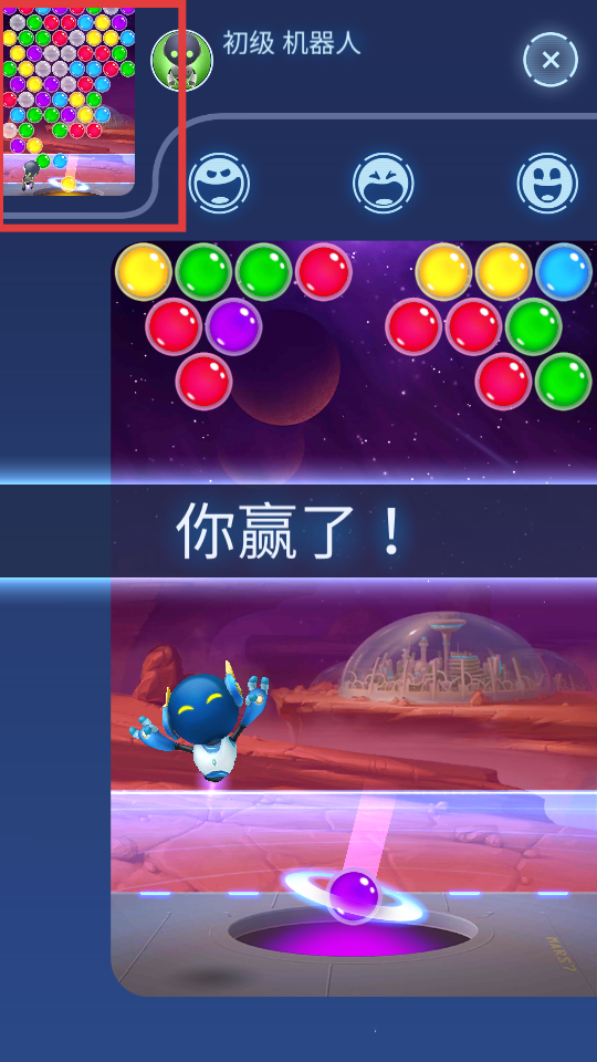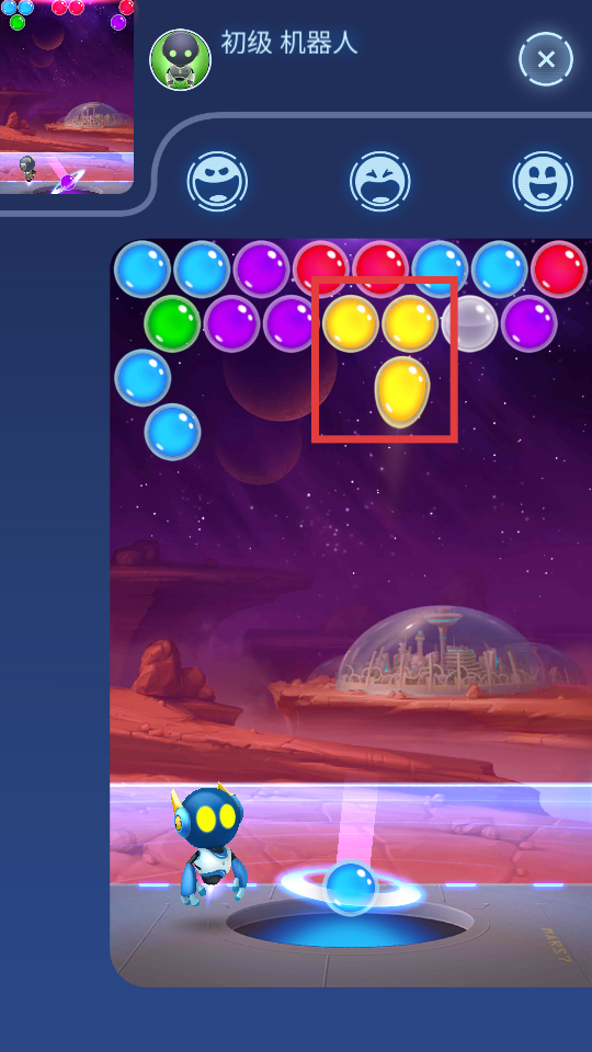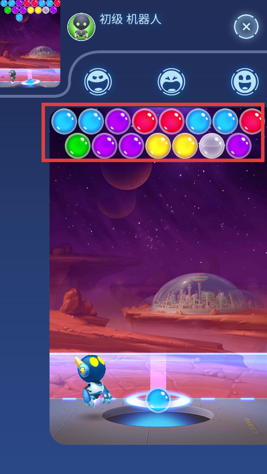 1、进入游戏,面对【初级-机器人】对手,观察红框内的彩色泡泡,准备发射。