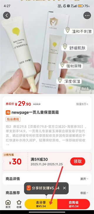 3、进入商品详情页,我们可以先领取【满59减30】的优惠券,还能选择【去分享】哦。