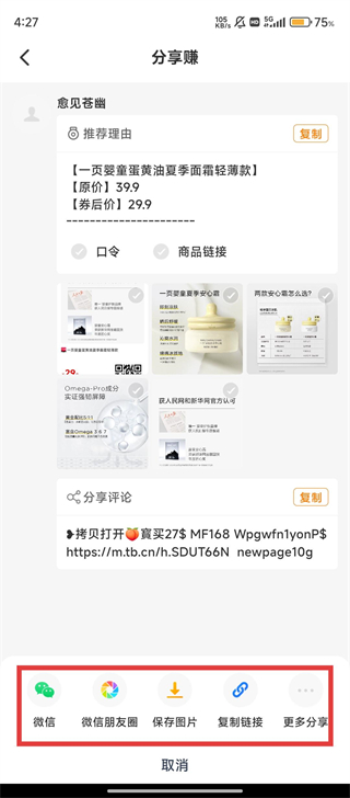 4、点击去分享后,我们可以复制【推荐理由】或【分享评论】,再选择【微信】等渠道分享,轻松赚返利呀。