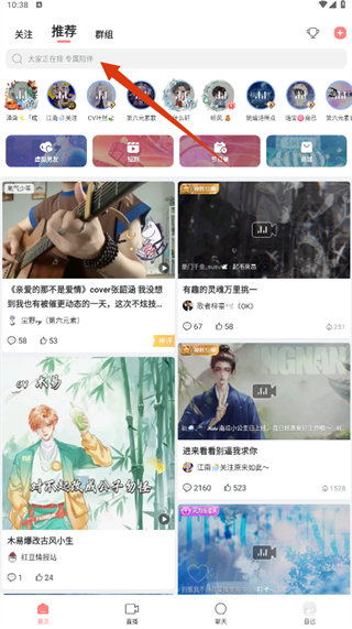 1、打开克拉克拉App,点击顶部【搜索】栏,开启查找喜欢内容的旅程吧。