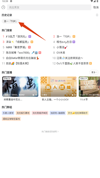 2、在搜索栏输入【洛一TOP】,也可从历史记录或热门推荐里选择哦。