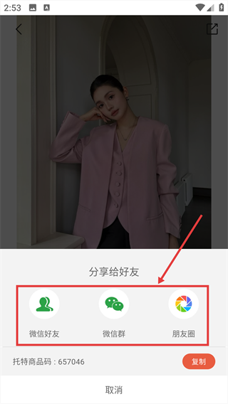 4、在分享弹窗中,选择【微信好友】【微信群】【朋友圈】等渠道,将该服饰商品分享给别人。