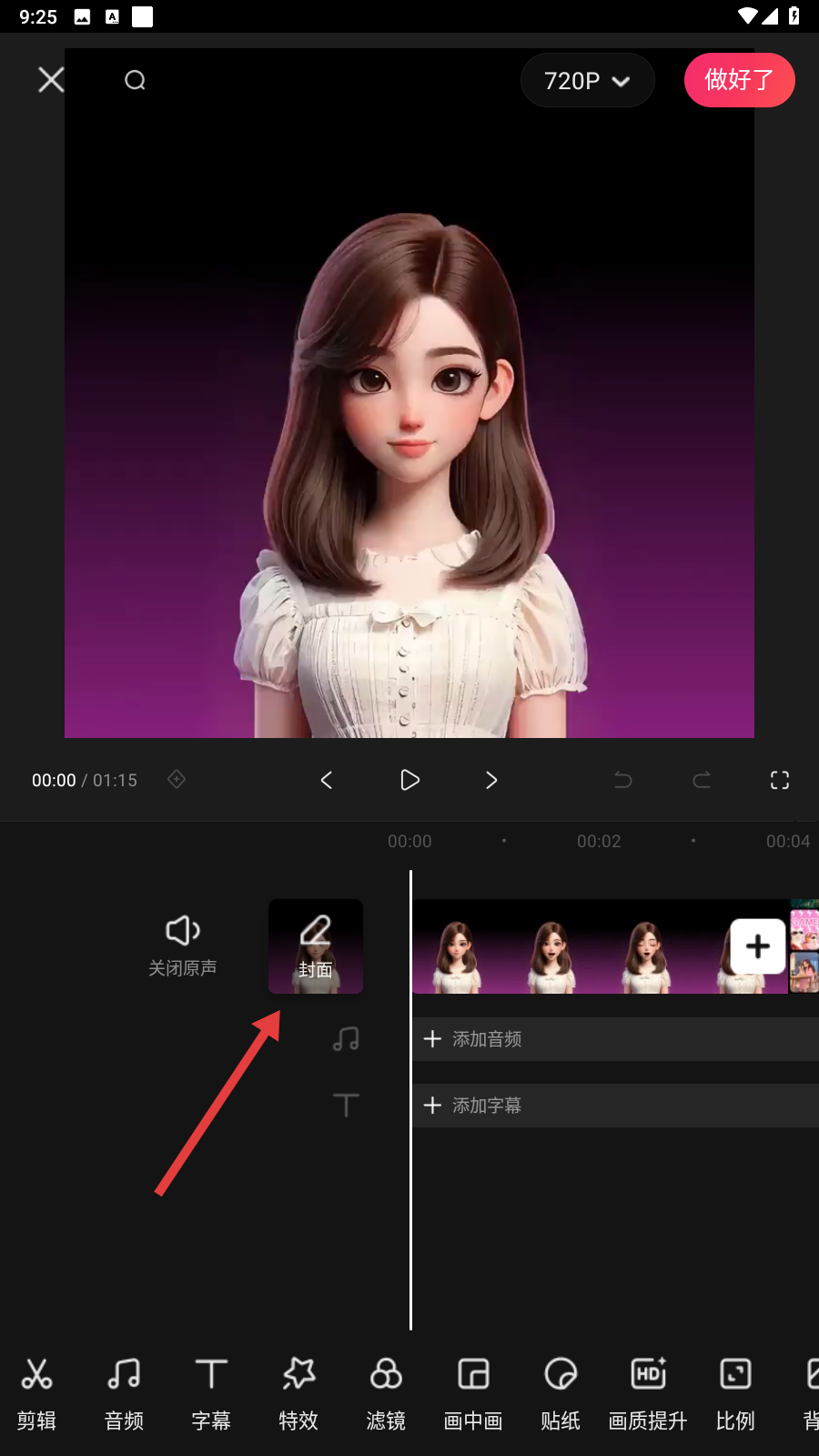 3、素材导入后,我们在剪辑页面中找到并点击【封面】按钮,为视频打造专属封面吧。