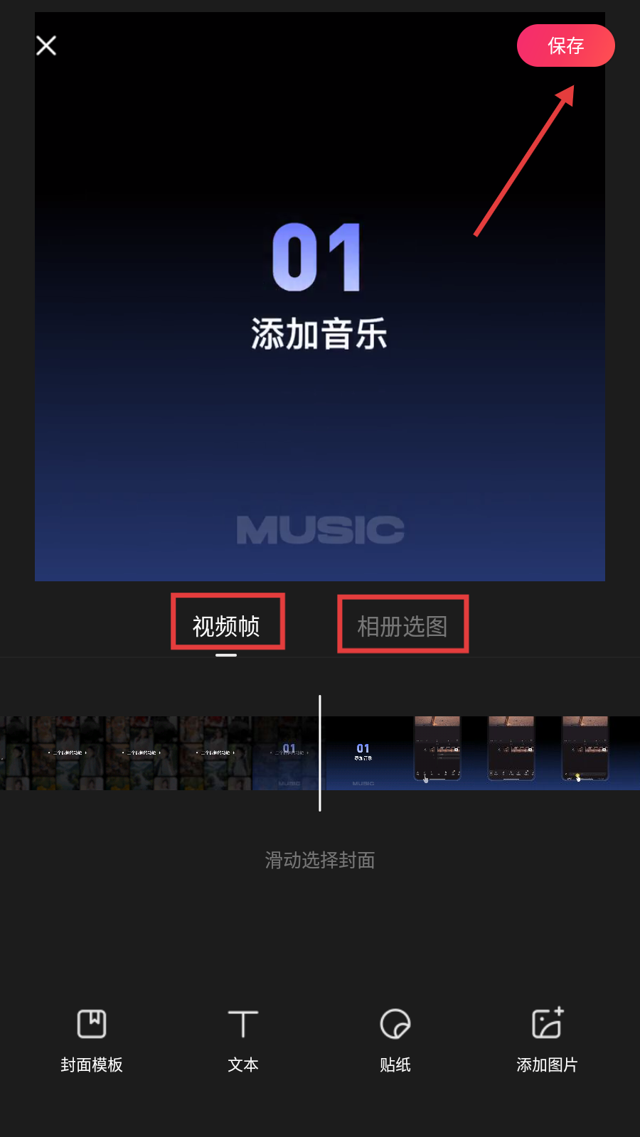 4、之后我们可以通过【视频帧】或者【相册选图】的方式选择合适的封面,设置完成后点击右上角【保存】按钮,封面就设置好啦。