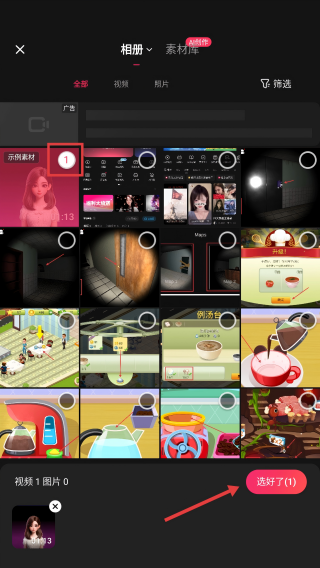 2、在相册里挑选好需要剪辑的视频或图片素材,选好后点击右下角【选好了】按钮,就能把素材导入到剪辑轨道啦。