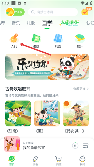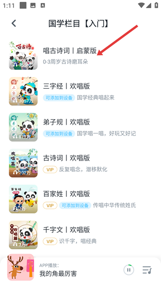 3、进入国学栏目【入门】后,我们选择【唱古诗词-启蒙版】,这里有适合0-3岁的古诗磨耳内容呢。